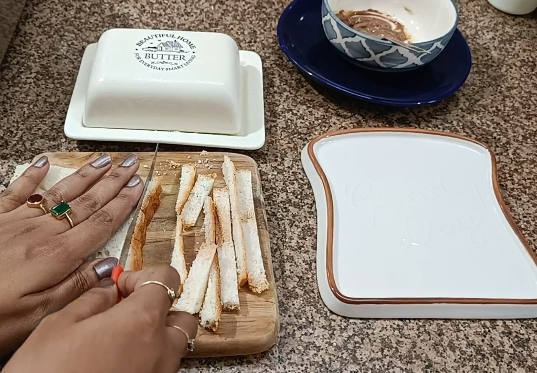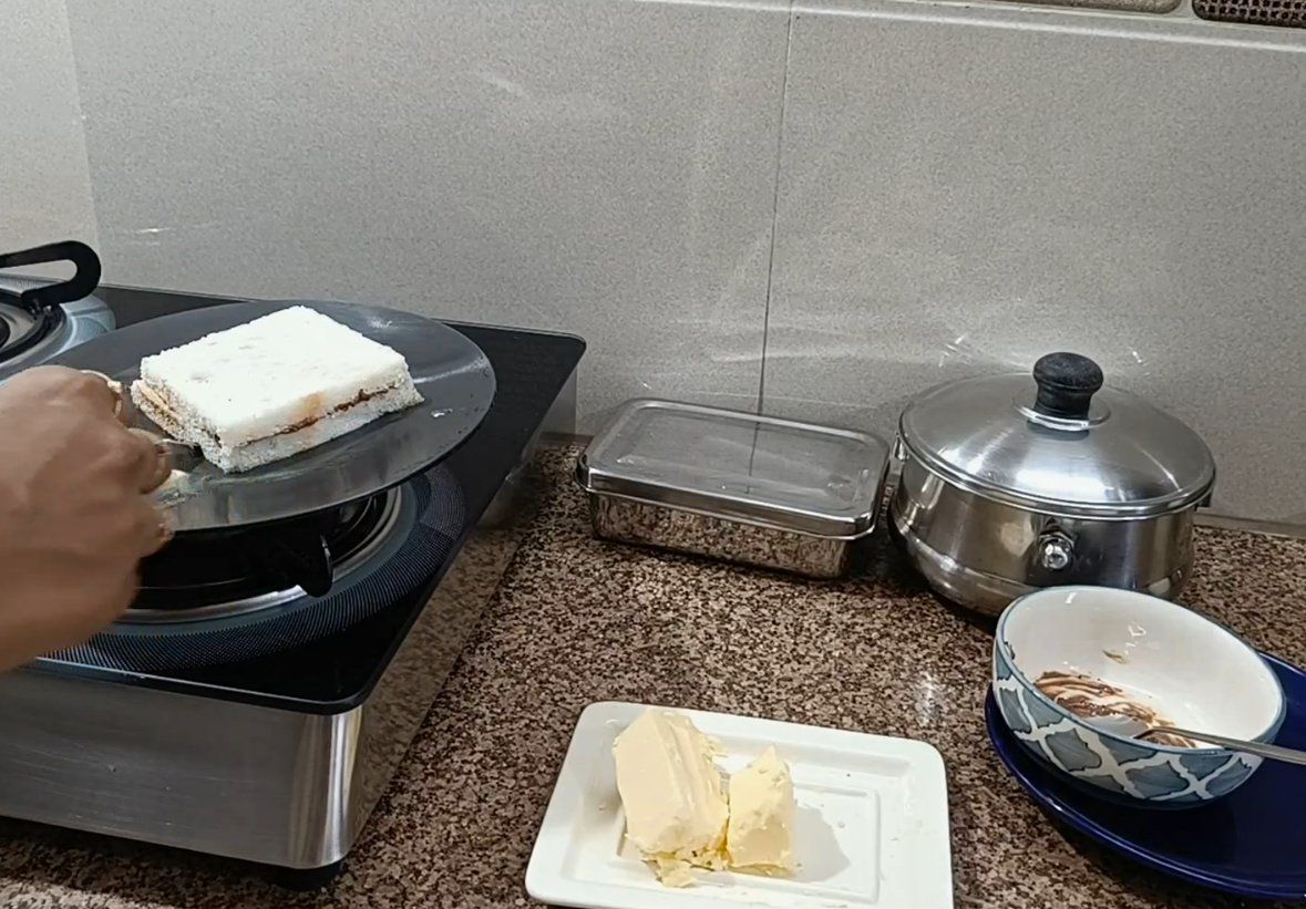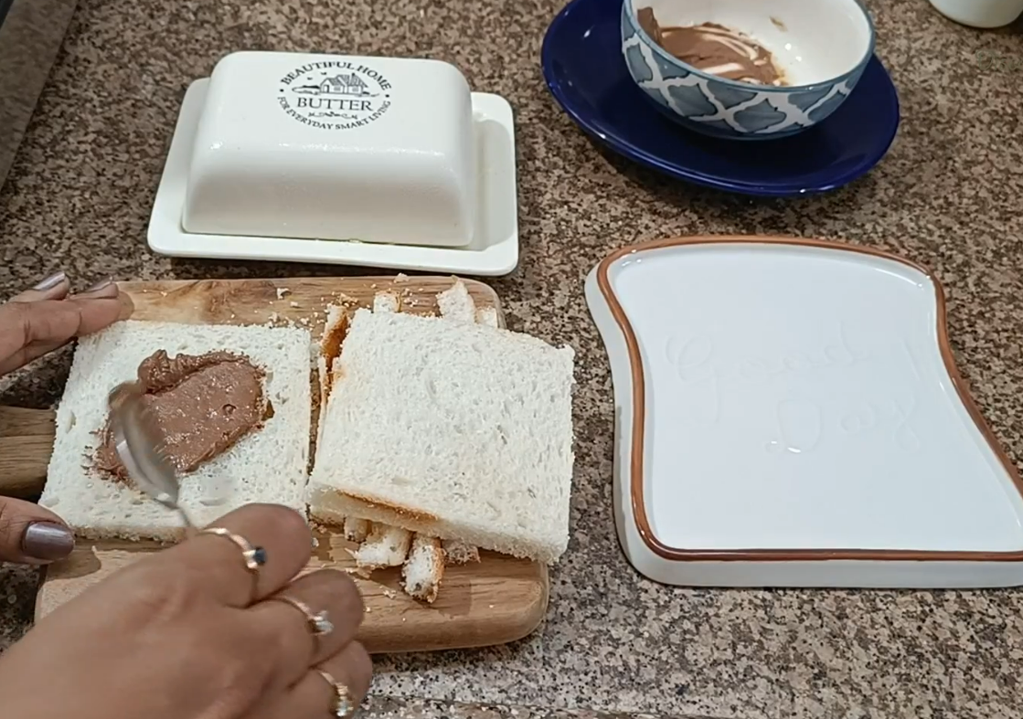 - In a white bread or any bread of your choice , remove sides, spread the chocolate and toast/grill it both sides with butter.